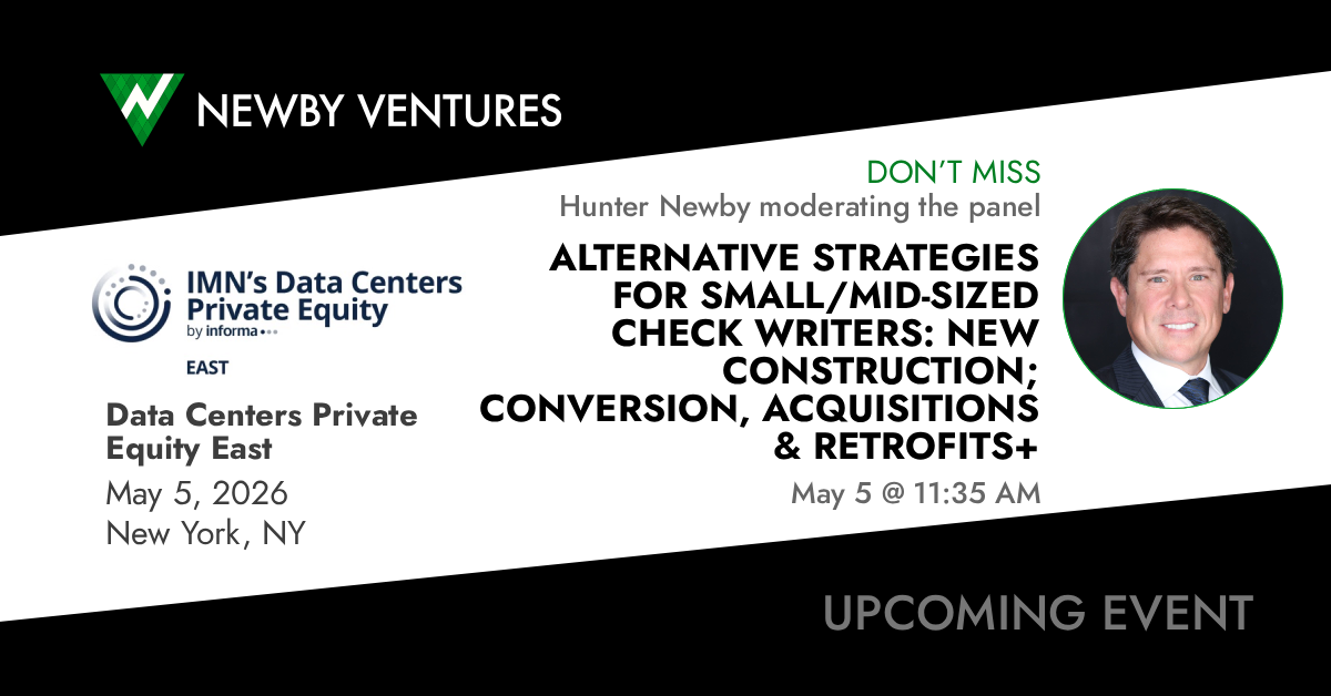 Connect with Hunter Newby at IMN's Data Centers Private Equity East in New York, NY on May 5, 2026. Hunter is moderating the panel "Alternative Strategies For Small/Mid-Sized Check Writers: New Construction; Conversion, Acquisitions & Retrofits+" at 11:35 AM. Event website