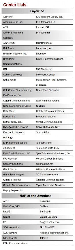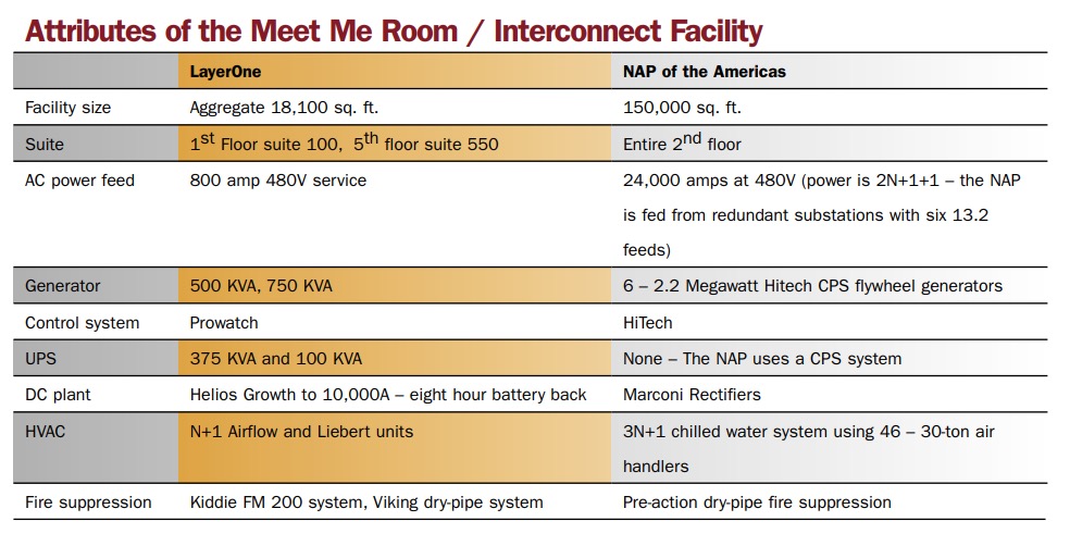 There is a great deal that can be said about both LayerOne and the NAP. The history of the NAP and the type of facility in terms of construction could take up pages, but what is particularly interesting about the NAP is that it is a core interconnection facility for major transport networks and a major Internet network access point. This is the only site in the entire “Meet Me” series that is both in one. That says a lot about it, as well as the clear difference between all of the other major core sites in North America and the Internet MAEs (metropolitan area exchanges), NAPs and sites such as Equinix and PAIX. The core interconnection points of the major transport and legacy time division multipex voice networks are not the same as the core Internet points. The fact that the NAP is both ties back into the fact that Miami got a late start, and they were able to plan the convergence.