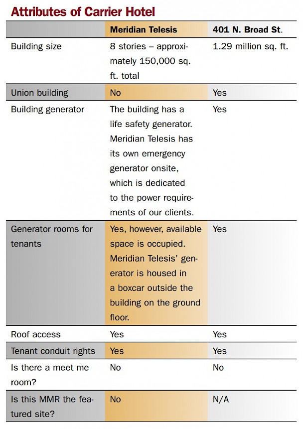 In this market two sites are frequently thought about when network operators are looking for interconnections. They are Meridian Telesis at 3701 Market St. and 401 North Broad St. But the two sites provide quite a contrast. Meridian Telesis is a data center operator and 401 North Broad St. is the largest carrier hotel in the city.