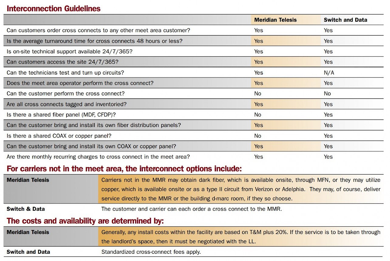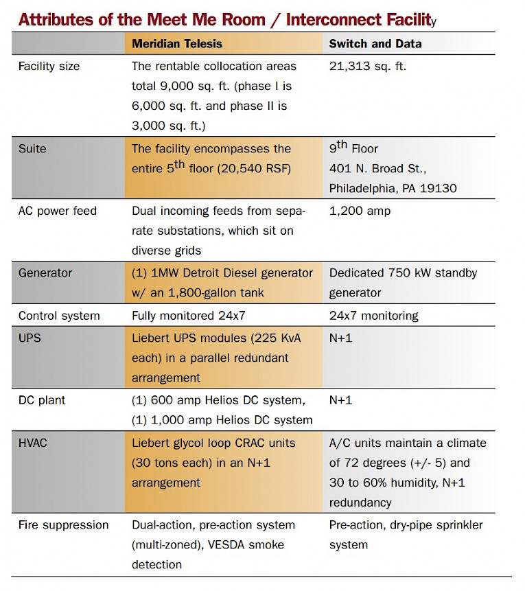 Comparing Meridian Telesis and Switch and Data should help network operators get a better understanding of the access offerings available in Philadelphia. At a high level, Switch and Data is more of a carrier-to-carrier interconnection point where large network providers exchange backbone fiber connections, as well as accomplish IP peering.